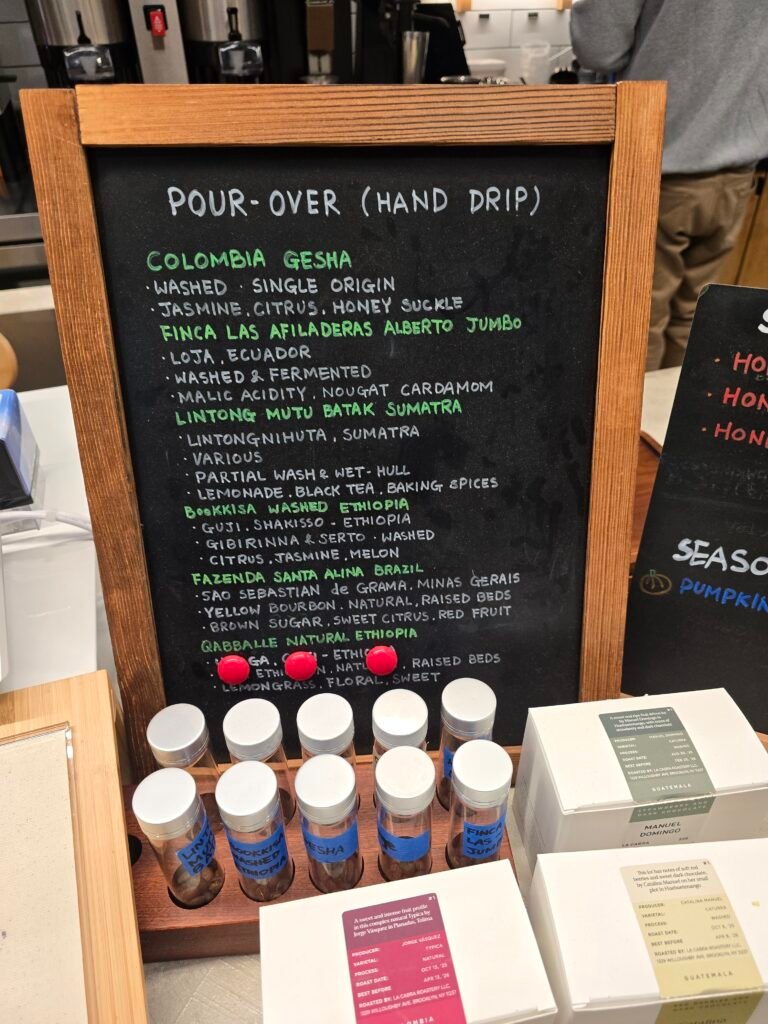 While I sipped my Sumatra, I took a look at their pour-over board. For a local shop, their lineup is surprisingly curated. They aren’t just stocking a generic “House Blend.” They are rotating through distinct origins and processing methods.