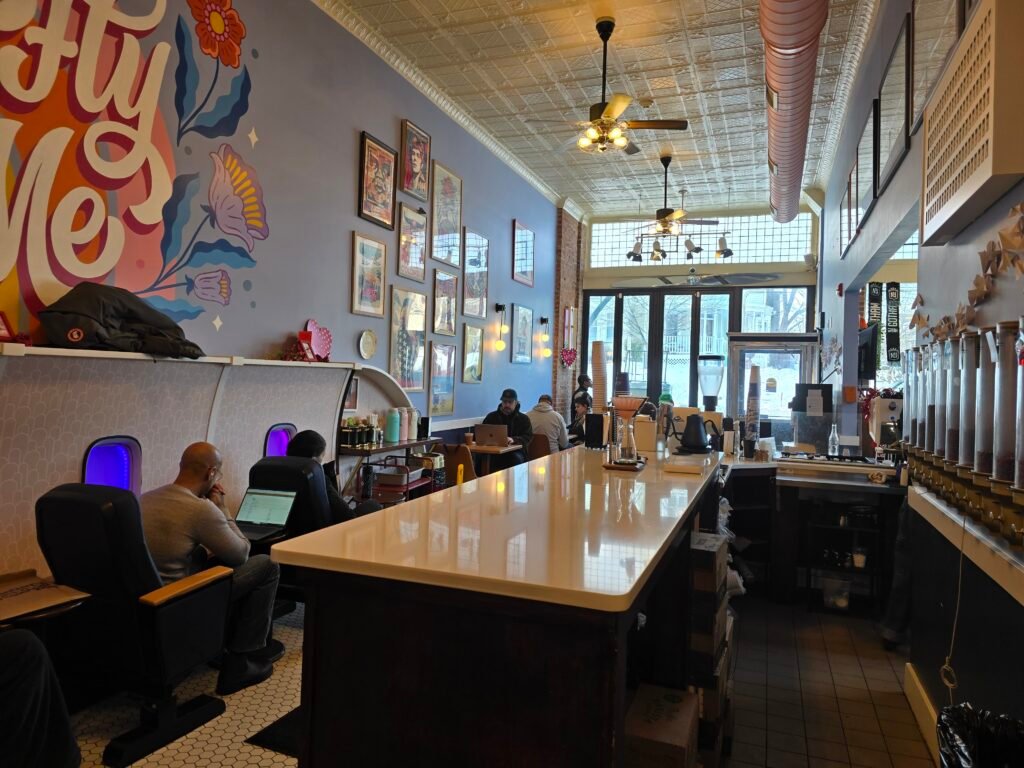 I’m glad I did. The vibe inside is just cool. They really lean into the “Paper Plane” name with a row of airplane-style seats along the wall, complete with little window decals that make you feel like you’re at cruising altitude. It doesn’t feel gimmicky, though—it just fits the atmosphere. The space is filled with fun details like paper plane decorations and shelves stocked with gear: Chemex, AeroPress, Hario drippers, kettles, and books. It felt like the perfect place to hide away from the cold afternoon.