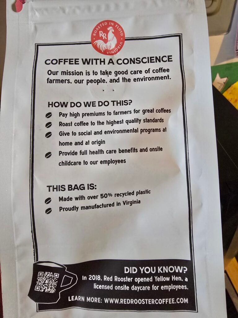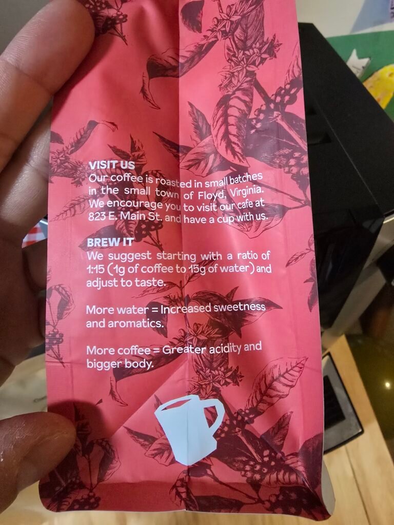 I’m including a photo of the bag below because I really love the message they put on their packaging. It tells the story of their roastery in Floyd, Virginia, and their philosophy on coffee. You can really tell that they care about transparency and where their beans come from—it’s not just about selling a product, it’s about the values behind it.