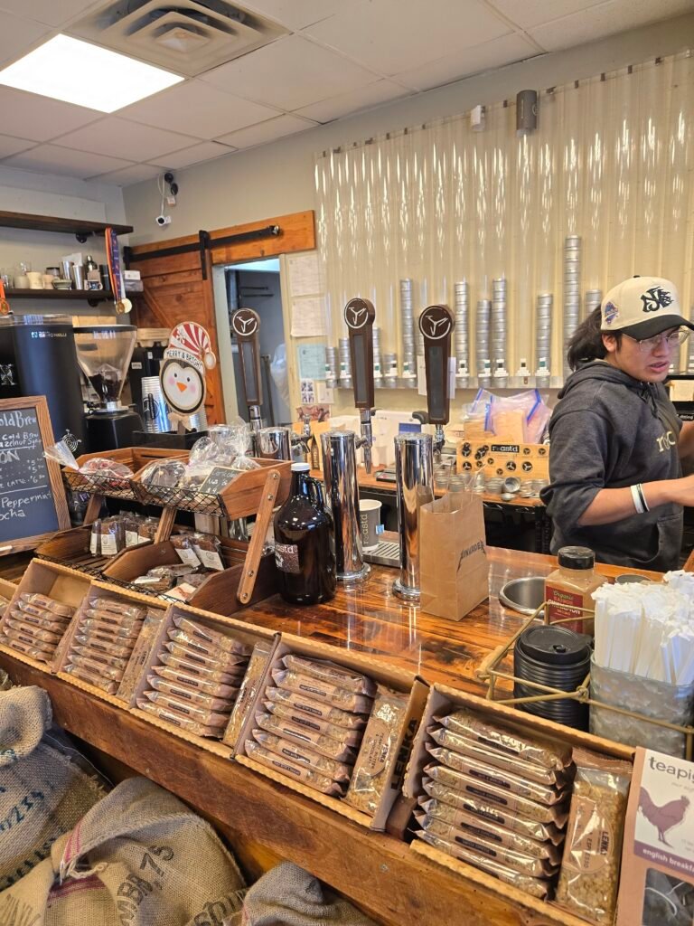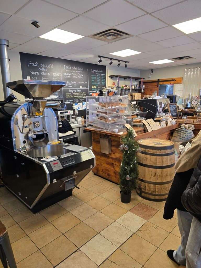 Anchoring the corner of the room is their massive industrial roaster. It’s not just for show—this is the engine room of the operation. The smell of freshly roasted beans fills the air, setting the tone immediately.