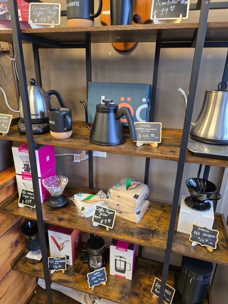 One thing I love about this shop is that they don’t gatekeep their coffee. On the shelves, they stock the exact same brewing gear they use behind the bar. You’ll find drippers, kettles, and filters for sale.